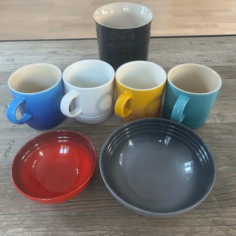 Le Creuset espressokopper i keramikk med assorterte farger. Settet inneholder flere kopper, hver med hank, egnet for servering av espresso.
