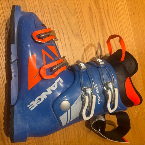 Lange RSJ 60 alpinstøvel i størrelse 22,5 / EU 35 (268 mm totallengde støvel) med svart og oransje farge. Støvelen har fire spenner for justering og er laget for alpint bruk.