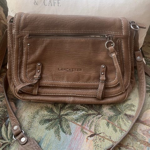 Pent brukt Lancaster Paris i beige skinn. Innsiden har semsket skinn.Vesken har en rektangulær form med konvoluttlignende klaff og en avtagbar skulderrem.