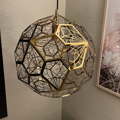 Lampen er laget av resirkulert plast og kjøpt på Bohus for ca 5 år siden. Den har hengt på et soverom og gir et mykt lys til rommet.