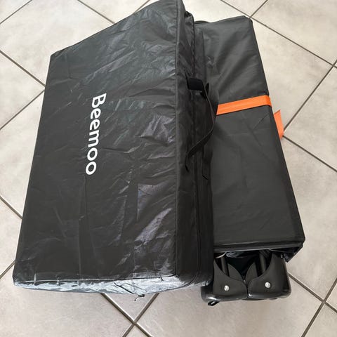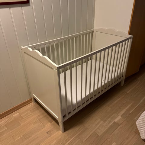 Lite brukt. Inkl. madrass. Ekstra madrass av skumgummi kan følge med. Lengde: 120 cm, bredde 60 cm. Bruksanvisning følger med. Må hentes.