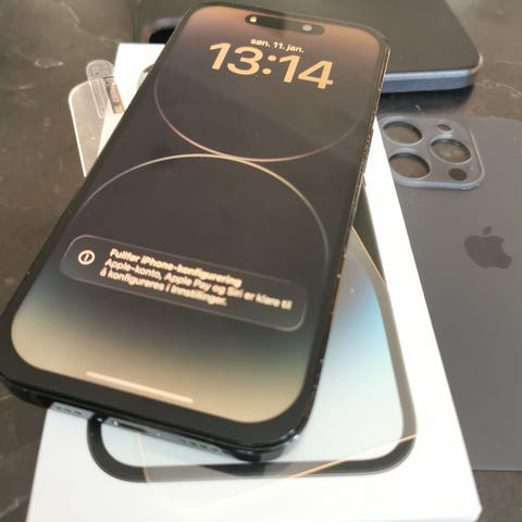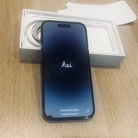 Apple iPhone 14 Pro mobiltelefon med 128 GB lagringskapasitet. Enheten har et svart design og leverer avanserte funksjoner for kommunikasjon og multimedia. Lite sprekk på kamera se bilde. Alt fungerer som det skal