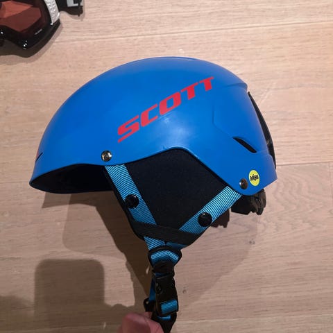 Scott Quiver JR Plus hjelm i blå farge, størrelse M (53-56 cm). Hjelmen er utstyrt med MIPS-teknologi for økt sikkerhet. Passer for junior bruk.