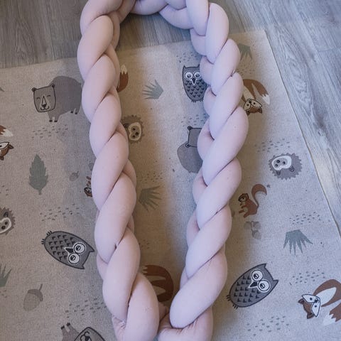 Sengeorm til å ha langs kanten i sengen til en baby/et barn. Den er ca. 3 meter. Fargene er rosa og hvit, og den har motiv av sauer.