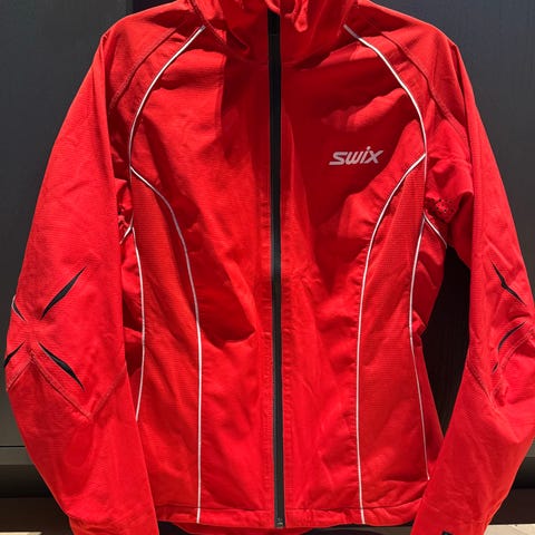 Pent brukt blå langrennsjakke fra Swix. Noen nupper og selve Swix-logoen er sprukket opp, ellers ingen synlig slitasje.
