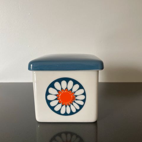 Figgjo Daisy servise med fat og skåler. Serviset har et blått og hvitt fargemønster med oransje og hvite detaljer i blomsterdesign. Produsert i keramisk materiale, designet av Turi. Passer til servering og dekorasjon.