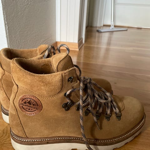 Stockholm Design Group støvler i størrelse 45 til herre. Laget av brun semsket skinn med snøring. Sålene har mønster for grep. Egnet for bruk som fottøy i kaldere vær.