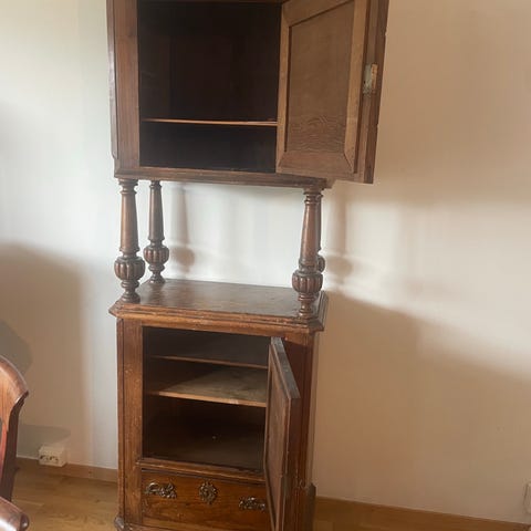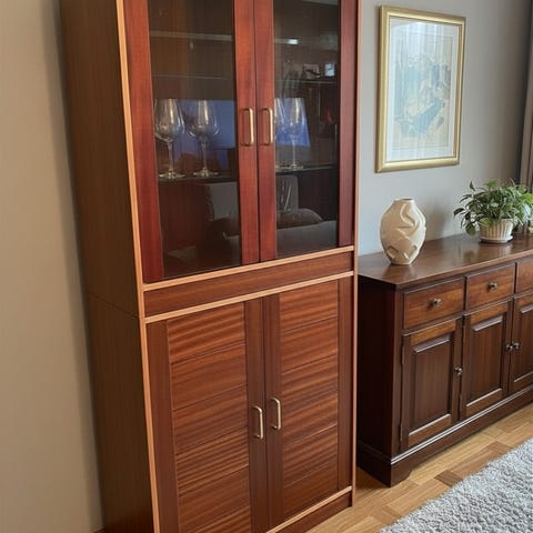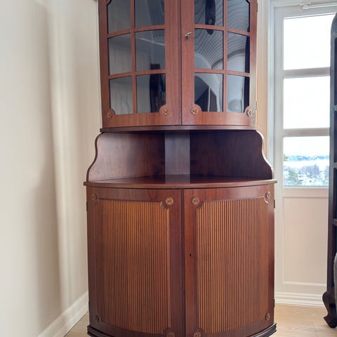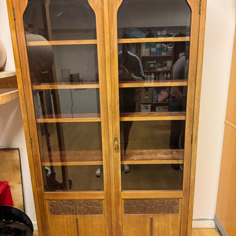 Skap i tre med glassdører og hyller