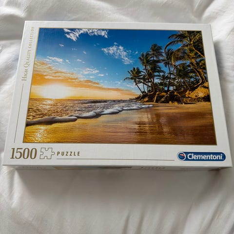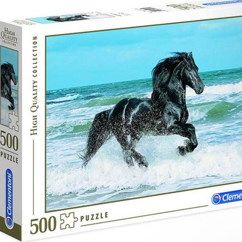 Clementoni High Quality Collection puslespill med 500 brikker. Motivet viser en brygge med hus over vannet under en rosa himmel. Puslespillet er laget i Italia.