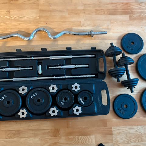 Treningsbenk som kan justeres i forskjellige vinkler og vekt stang med tre forskjellige vekter(1,25 og 2,5 og 5 kg)