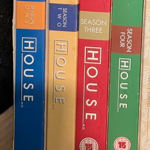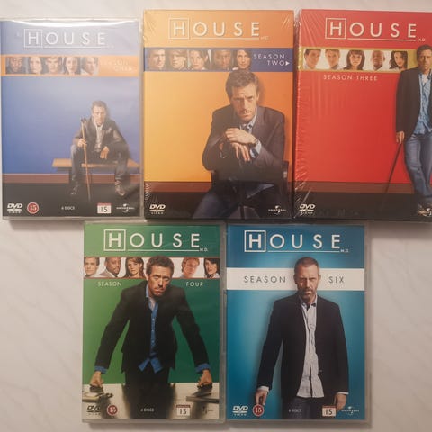House DVD-serie med sesongene 1 til 8. Serien inneholder alle episodene fra de åtte sesongene, pakket i fargede omslag med sesongnummer. Produktet er egnet for samlere og seere av TV-serien House.6-7-8 er uåpnet