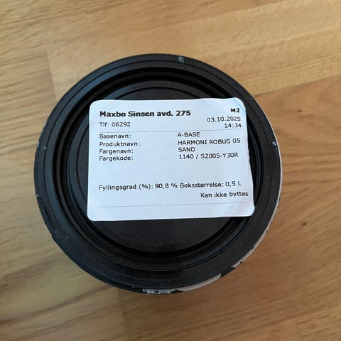 Selger fargeprøven Laurbær fra Jotun. Kjøpt 7. januar 2026. Malt en flate på 40x40 cm med den bare, så det er knapt tatt noe fra malingspannet. Koster 99 kroner i butikk.