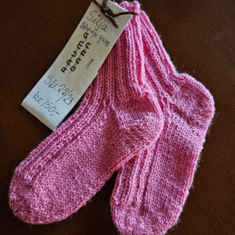 Nystrikkede sokker til barn selges for kr 70 pr par.