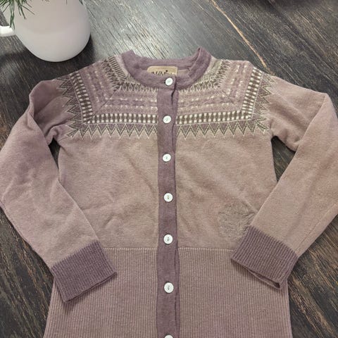 1. Sokker i flerfarget rosa/lilla strikket i tynt sokkegarn. Lengde 14 cm fot, str. 21/22.