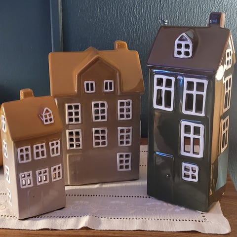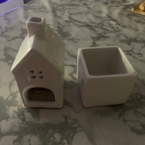 IKEA dekorasjonshus laget i hvitt keramikk. To hus med forskjellige former og detaljer, ene med mulighet til å sette lys inni, andre med batteri.