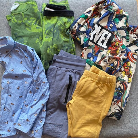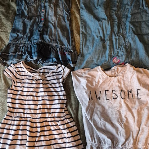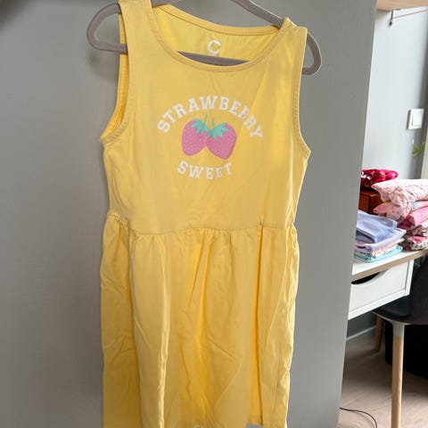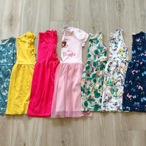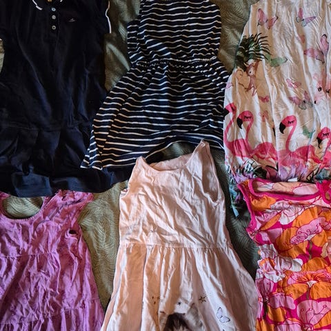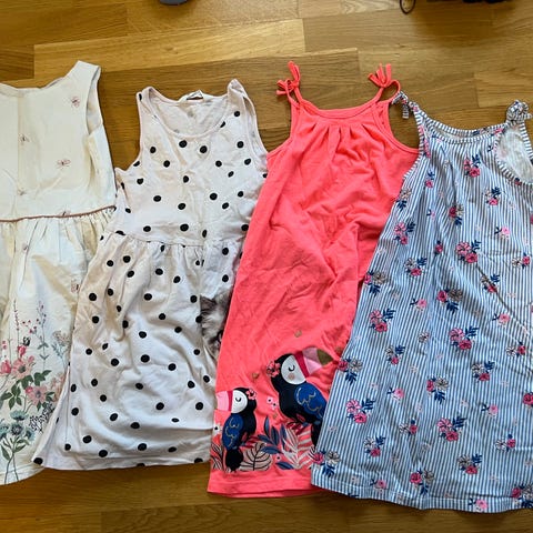 Sommerkjoler fra H&M i str 122/128. Noen er knapt brukt, mens andre er mere brukt. Eneste anmerkningen jeg kan se er noen svake skjolder nederst på den rosa kjolen med unicorn.