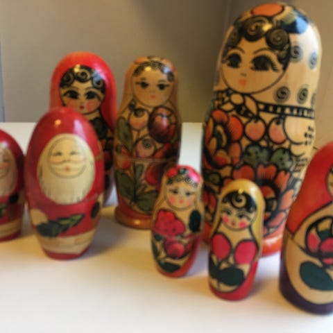 Storbog flott russisk dukke i tre. Babushka fra Russland. Retro leke/ vintage samlerobjekt.
