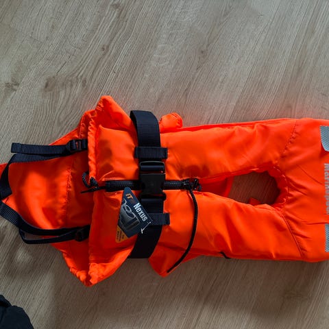 Rød redningsvest med flyteevne på 100N, utstyrt med refleksdetaljer for økt synlighet. Vesten har justerbare stropper og er designet for sikkerhet på vannet. Alle glidelås, spenner og klips fungerer fint. Kan hentes i Arendal av kjøper, eller sendes mot et frakttillegg.