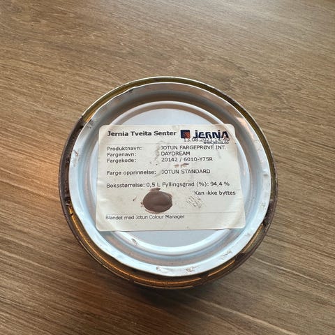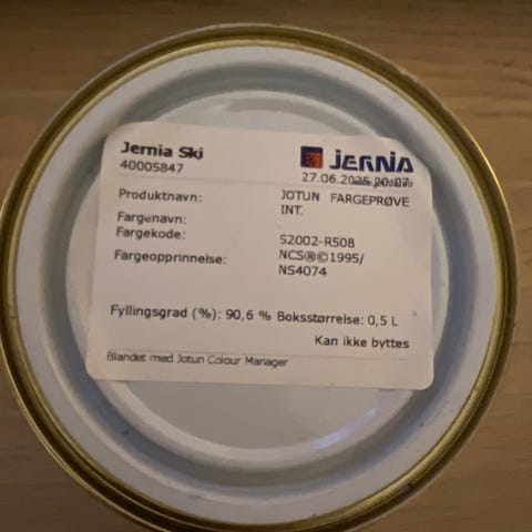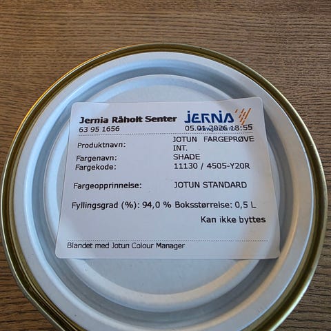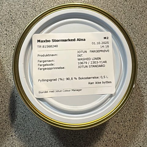 Selger fargeprøven Green Harmony fra Jotun. Kjøpt 5. januar 2026. Malt en flate på 40x40 cm med den bare, så det er knapt tatt noe fra malingspannet. Koster 99 kroner i butikk.