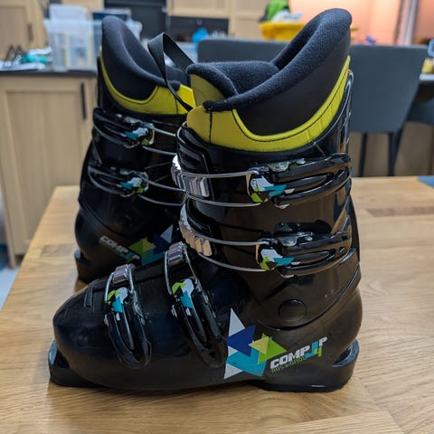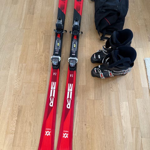 Vølkl alpinski med twin tip 138 cm med tilhørende Marker binding 7.0 og Dalbello skistøvler 25,5 i hvit farge (Gaia Comp) med 4 justerbare spenner (små i størrelsen). Utstyret er godt brukt.