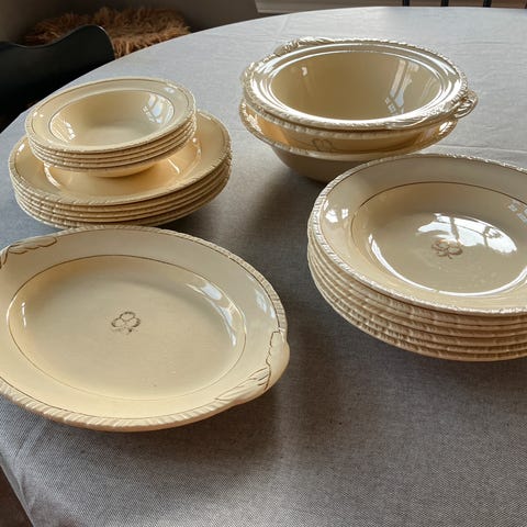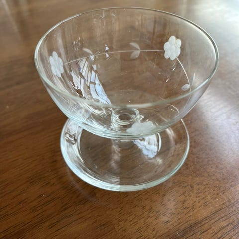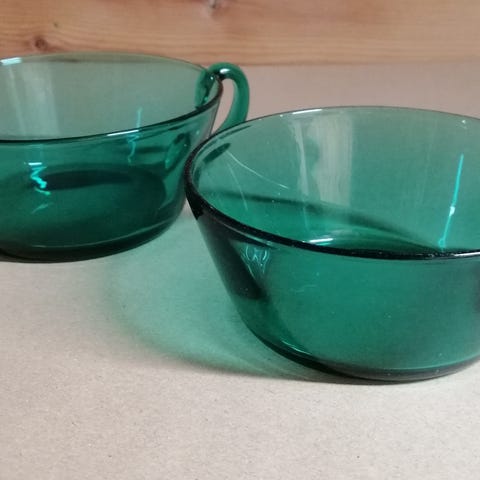 6 stk brukte dessertskåler, hele og pene, ingen skår, men noe slitasje i overflaten , likevel pene.