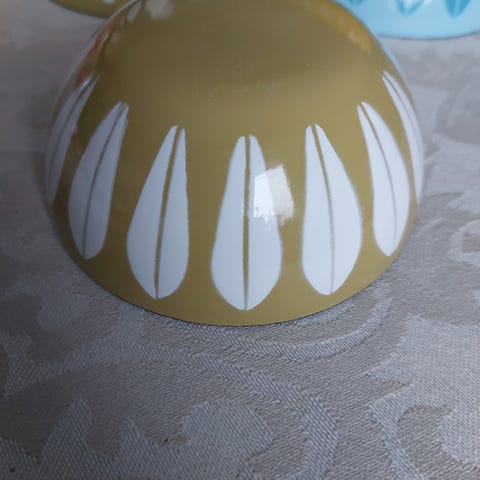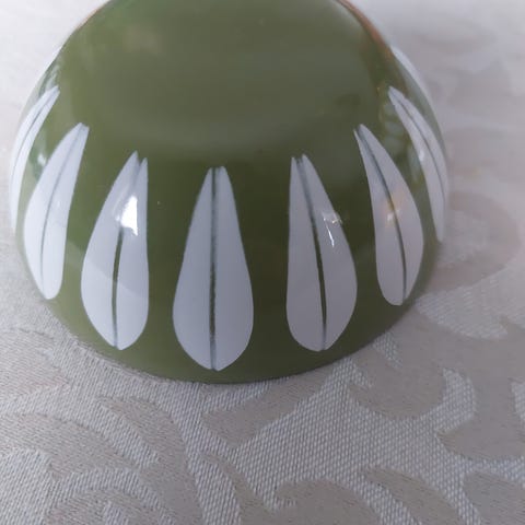 Har en samling Cathrineholm som nå skal nedskaleres noe. Disse skålene er samlet gjennom mange år og håndplukket på kvalitet. Alle bollene er i svært god stand - noen ser helt ubrukt ut, andre har små tegn til bruk. Denne minste størrelsen, 10 cm i diameter, er skjønnheten selv. Kan brukes til alt mulig som serveres på bordet, sjokolade, nøtter, oliven etc... Ingen av mine skåler er vasket i oppvaskmaskin - da ødelegges glasuren og skålene blir matte.