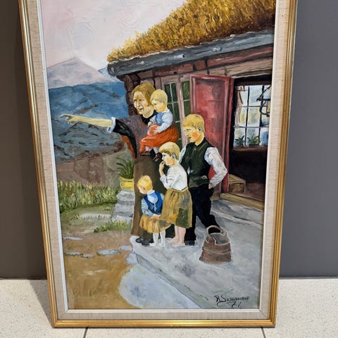 R.S. Kjoldhorne maleri som skildrer en familie med barn ved et hus. Motiv med detaljerte figurer og naturlig bakgrunn. 77x52 cm