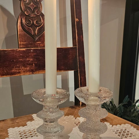 Selger 2 stk Iittala Ultima Thule vaser, designet av Tapio Wirkkala. Klassiske finske designikoner med is-struktur i presset glass. Begge fra eldre produksjon og med originalt Made in Finland merke.