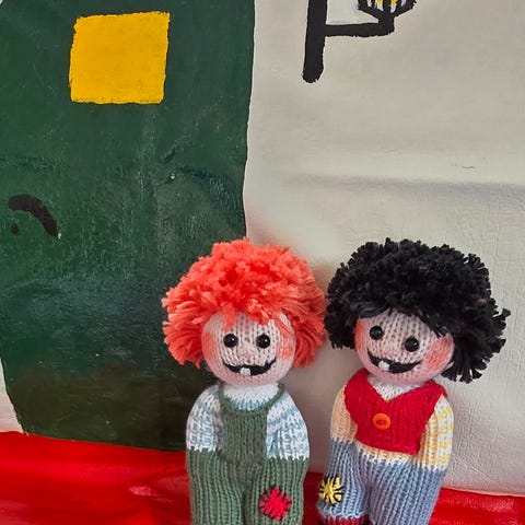 Ca. 24–25 cm høye Karius & Baktus-figurer, nøye håndheklet av 100 % bomullsgarn.