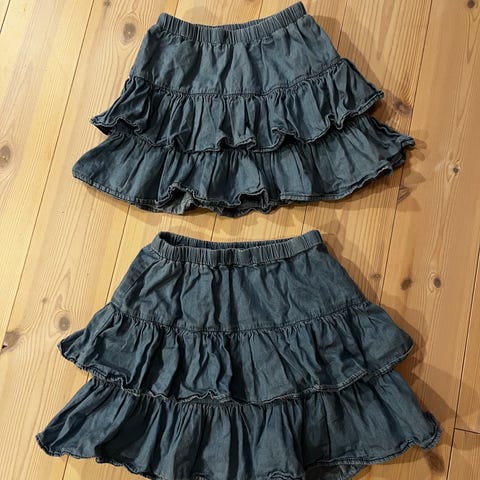 To "denim"skjørt (stretch - 8% elasten) og to topper med kort erm selges samlet.