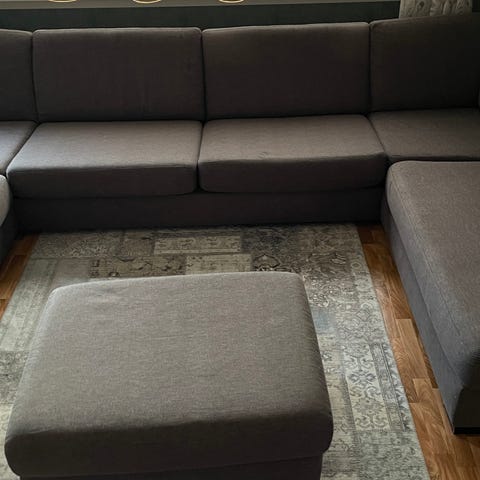 Divanen kan plasseres både på høyre og venstre side. Justerbare ryggstøtten (venstre ryggstøtte har en lys flekk som vi ikke helt har klart å vaske bort).