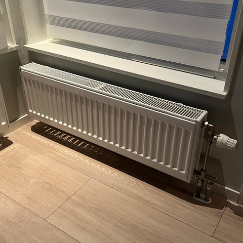 2 radiatorer med termostatventiler selges grunnet oppgradering til større radiatorer.. Radiatorene er egnet for vannbåren sentralvarme. Termostatventilen (Lyngson) har justerbare innstillinger for temperaturkontroll. Radiatorene er beregnet på gulvmontering. Hver ovn har to paneler.