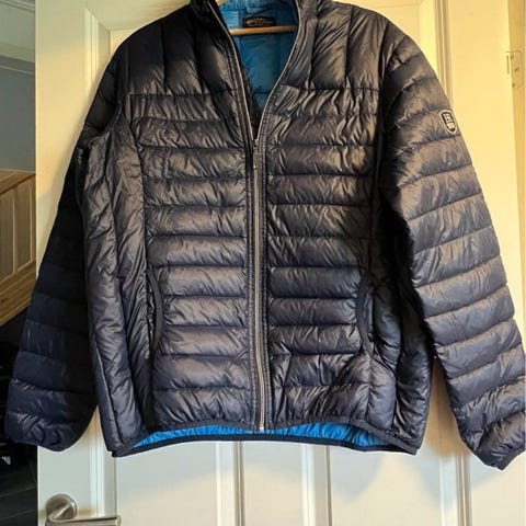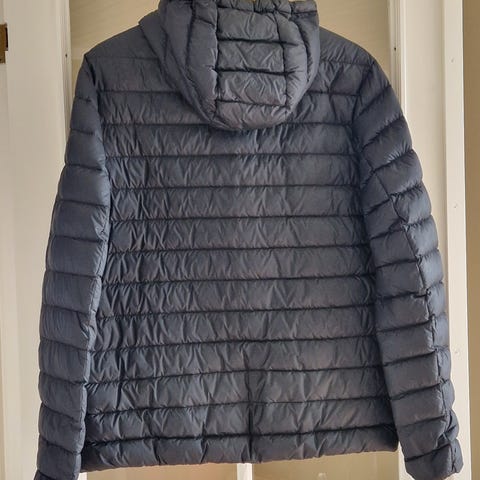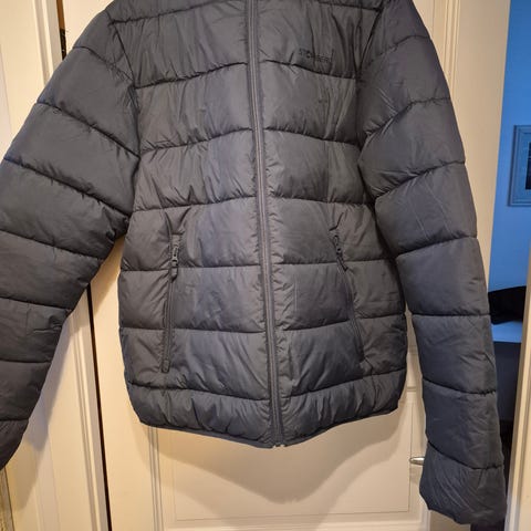Lett sort dunjakke. Jakken har hette, glidelås hele veien i front. Grei overgangjakke eller jakke til bruk under andre jakker på kjøligere dager. Normal passform. Jakka kan pakkes sammen i lomme og lukkes med glidelås. Eneste bruksmerke er at det har vært festet en navnlapp som er fjernet øverst i jakken på innsiden (se bilde)