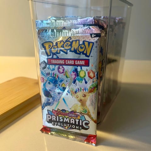 Pokémon TCG Prismatic evolution Booster Bundle. Inneholder booster-pakker med Pokémon-kort fra Prismatic V-serien. Produktet er beregnet for samlere og spillere av Pokémon Trading Card Game. 6 packs i en bundle