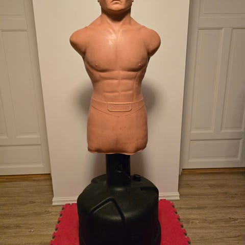 Dukke for å øve på diverse kampsport. Kjøpt ny av mannen for 1-2 år siden. Brukt sporadisk hjemme. Tar mye plass, og skremmer vettet ut av gjester. Mannen liker den, men jeg har endelig fått overbevist han om at den må ut. Håper den kan plage noen andre enn meg fremover.