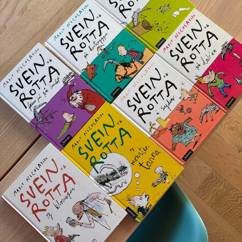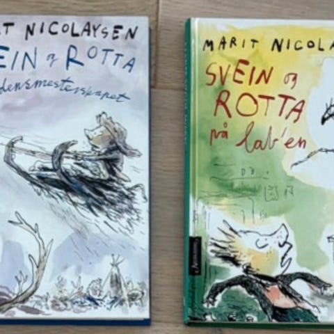Marit Nicolaysens Svein og Rotta barnebøker, to bind med titlene 'Svein og Rotta går for gull' og 'Svein og Rotta på feriekoloni'. Bøkene er illustrert og skrevet på norsk, egnet for barn. Inneholder humoristiske historier om karakterene Svein og Rotta.