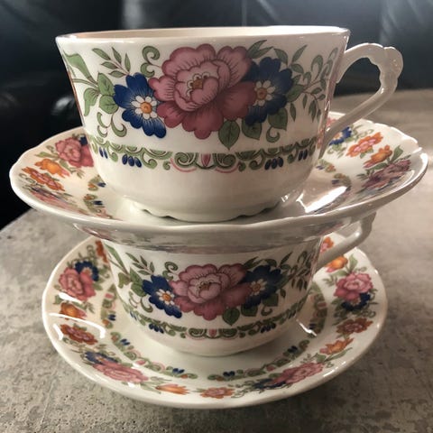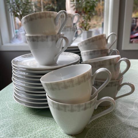 Selger kaffeservise etter besteforeldre. Ordentlig porselen som er lagd i Polen. Muggen hører egentlig ikke til kaffeserviset, men mønsteret er veldig likt og den er også laget i Tyskland. Skikkelige saker.