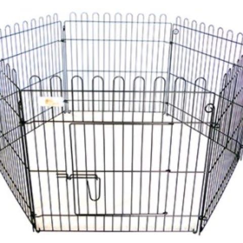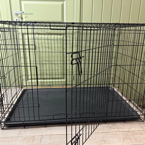 Dobbel hundebur laget av aluminium og tre, med to separate rom. Hver seksjon har metallgitter foran og solid trepanel bak og under. Burene har dør med låsemekanisme for sikker lukking. Egnet for transport eller oppbevaring av hunder.