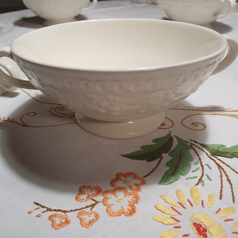 8 nydelige grønne suppetallerkener med stett ( nye ) Hver rommer 5dl og tar seg godt ut på bordet. Bredde øverst 14 cm, høyde 9,5 cm. Selges samlet. Sender kun med Post Nord 129kr eller Norgespakken 135kr