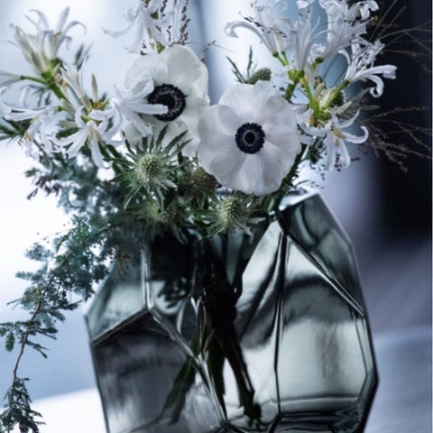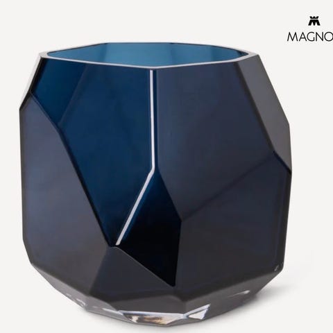 Magnor Glassverk Iglo vase i røykfarget glass. Vasen har et moderne, fasettert design. Egnet for dekorasjon og blomsterarrangementer.