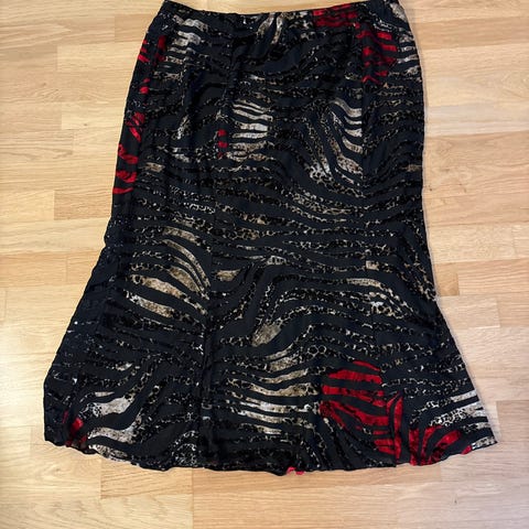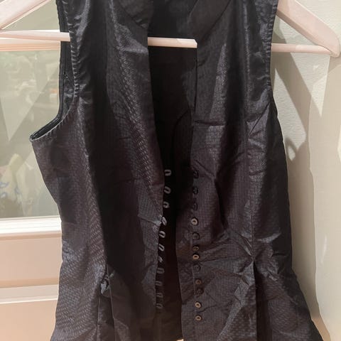 Jakken har skulderputer og er i str 50, blusen er str 48.