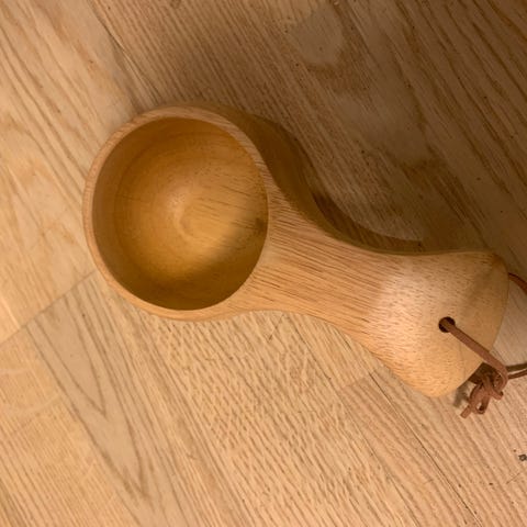 Fin og solid trekopp selges pga plass. Skinnrem festet til.