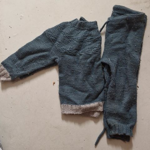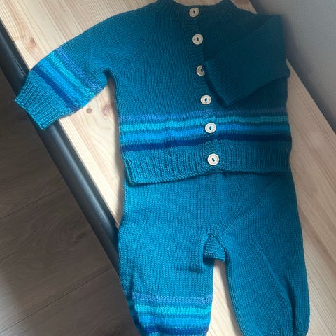 Meget pent hjemmestrikket sett i merinoull i strl 1-1,5 år. Ble dessverre nesten ikke brukt da jeg skulle «spare på det» og plutselig ble det for lite… ta gjerne kontakt for nøyaktige mål på settet.