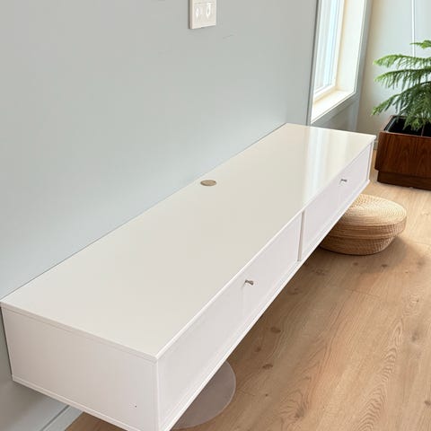 Fint og tidløst gangmøbel fra Bolia - to elementer som henges på vegg: åpen hylle i eikefiner og skuff hvitbeiset. Selges pga flytting! Henting avtales.