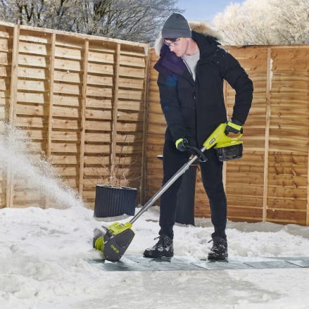 Pent brukt Ryobi snøskuffe med batteri og lader selges. 25cm skuffebredde, og tar snø opp til ca 15cm