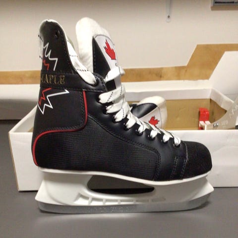 Roces ishockeyskøyter i størrelse 41. Skøytene har et svart design med hvite og røde detaljer. Egnet for ishockeybruk.