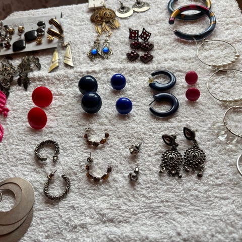 Ulike øredobber i assorterte farger og materialer. Ulike festetyper og design.