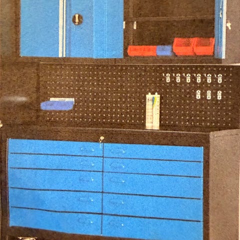 Verktøyskap med 10stk blå plastskuffer per skap for organisering av smådeler. Totalt 40stk.