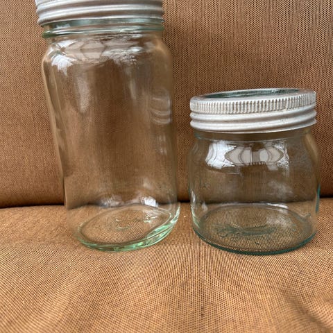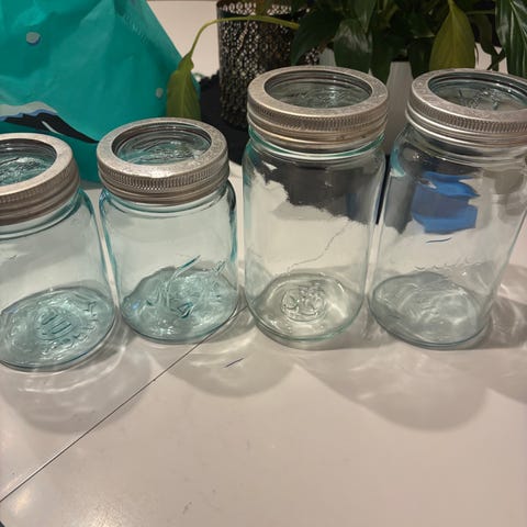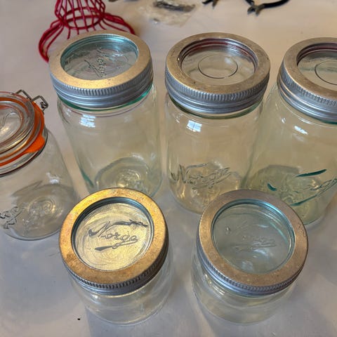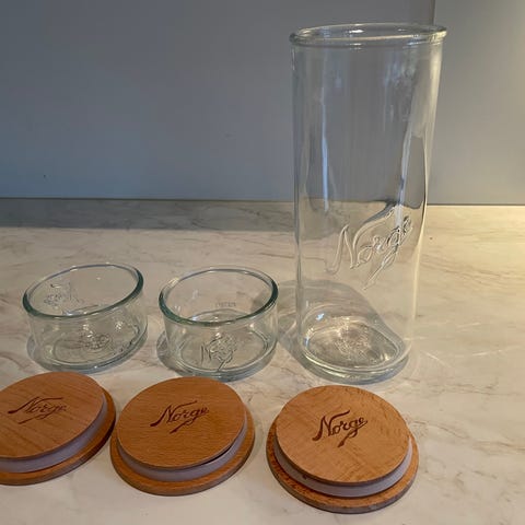 Norgesglass med ulike størrelser. Glasskrukkene har metall/glasslokk. Det er noen pakkninger der, men de må nok byttes ut alle. Selges samlet