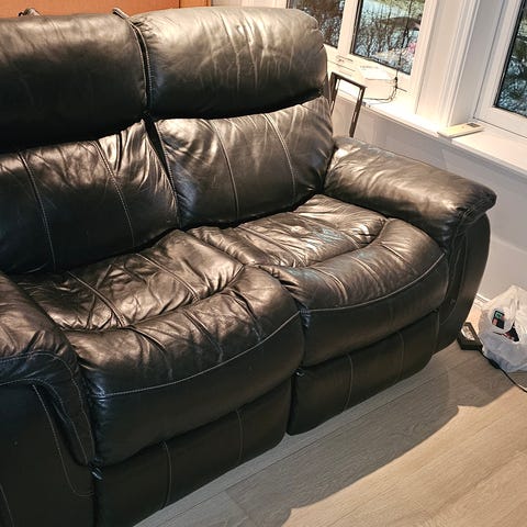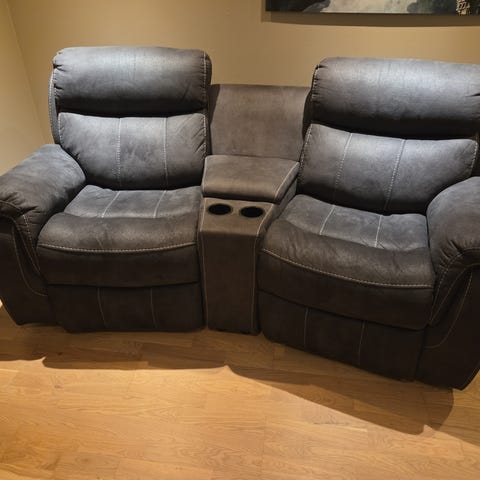 Kinostoler i stoff, stolene henger sammen, alle stolene har mulighet for å legge ned ryggen. Stolene er noen år, men er pent lite brukt.